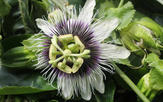 百香果,是西番莲科西番莲属的草质藤本植物,长约6米;茎具细条纹,无毛;花瓣5枚,与萼片等长;基部淡绿色,中部紫色,顶部白色,浆果卵球形,直径3~4厘米,无毛,熟时紫色;种子多数,卵形。花期6月,果期11月。