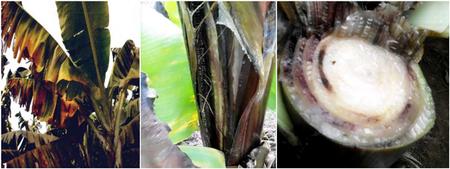 植株感病后,首先在下部叶片从叶缘开始变黄,然后向中肋发展,黄化的叶片叶柄软折垂挂,严重时整株叶片干枯死,假茎外部近地处有纵行裂缝。纵剖病株假茎,可看到病变的维管束褐色条纹;横切则呈黄红色或红棕褐色斑点或斑块。